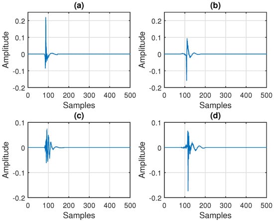 Impulse responses used in the first set of simulations from Section 6 (according to the G168 Recommendation [63]), with and : (a) the first network echo path from [63], (b) the second network echo path from [63], (c) the fifth network echo path from [63], and (d) the sixth network echo path from from [63].