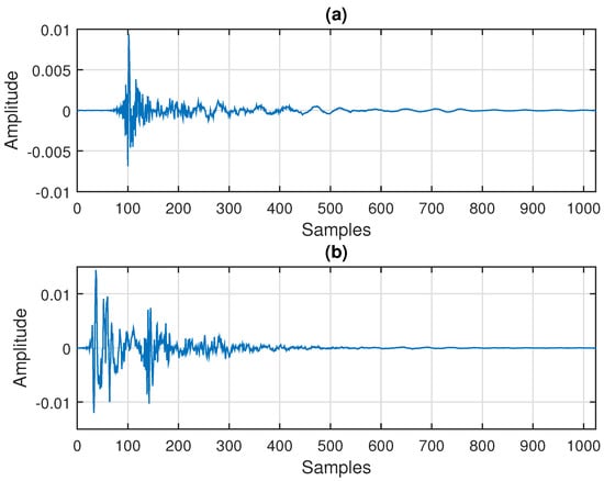 Impulse responses used in the second set of simulations from Section 6, with and : (a) right acoustic echo path and (b) left acoustic echo path.