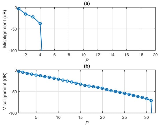 As shown in Figure 17, the conventional Wiener filter could not obtain an accurate solution for small values of the distortion parameter (i.e., closer to 0). For example, when using , its misalignment could not reach dB even with a large amount of data (i.e., 10,000); and for less data (e.g., ), it provided a far from accurate solution. These cases are considered in Figure 24 and Figure 25, using ; 10,000 and 2500, respectively. For N = 10,000 (Figure 24), the iterative Wiener filter outperformed the conventional solution for and 12. The decomposition using reached the misalignment level provided by the conventional Wiener filter. However, the differences (in favor of the iterative version, for all the values of P) were significant when , as supported in Figure 25.