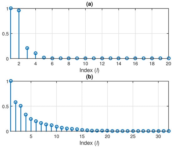 In order to show the validity of this approach, let us consider two scenarios that will also be detailed in the simulations provided in Section 6. In the first scenario, we consider impulse responses from the G168 Recommendation [63], which are network echo paths of length , as depicted in Figure 3. In this case, the decomposition was performed using and . In the second scenario, we used two acoustic impulse responses (i.e., ), each one having coefficients, as depicted in Figure 4. Here, we set for the decomposition. In both cases, we evaluate the normalized misalignment from (55) and the evolution of the singular values () of the matrix . As we can see in Figure 5, the normalized misalignment decreased with the value of P. This was much more apparent in the first scenario (corresponding to Figure 3), where the rank of resulted in , as shown in Figure 5a. Consequently, a good approximation was obtained for . In case of the acoustic impulse responses (i.e., the scenario from Figure 4), the resulting matrix was closer to being full rank, so that a larger value of P was required to obtain a good approximation. Nevertheless, as we can notice in Figure 5b, a value of P significantly lower as compared to led to reasonable attenuation of the misalignment (e.g., around dB). This behavior is also supported in Figure 6, where we can notice the decreasing trend of the singular values (which are normalized to the maximum value).