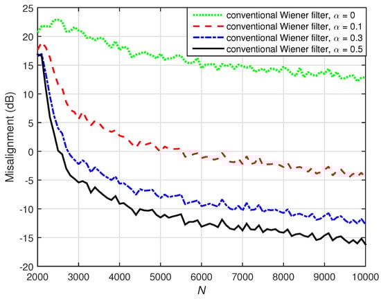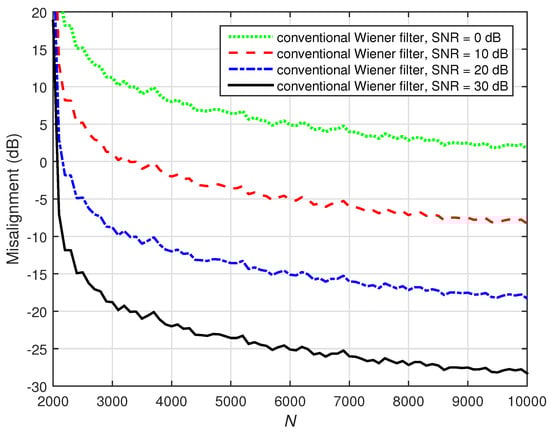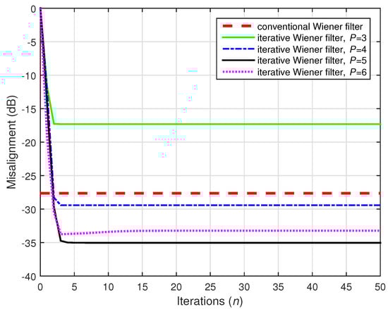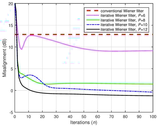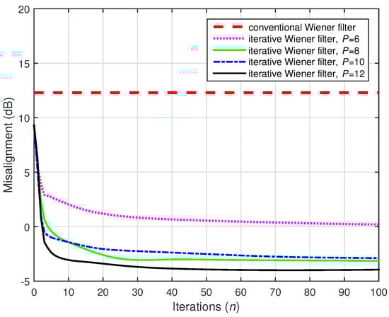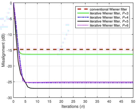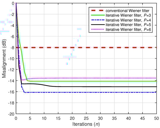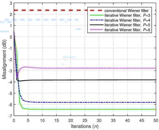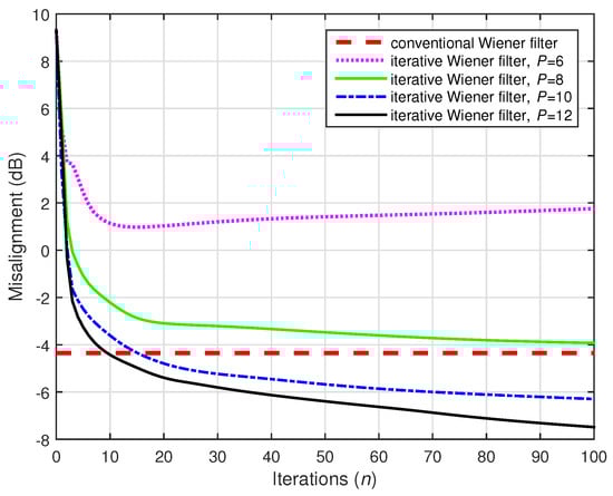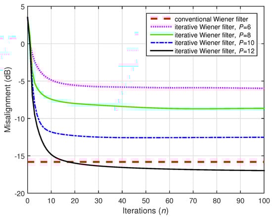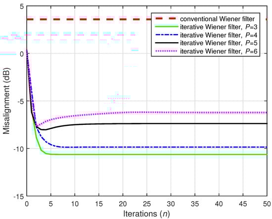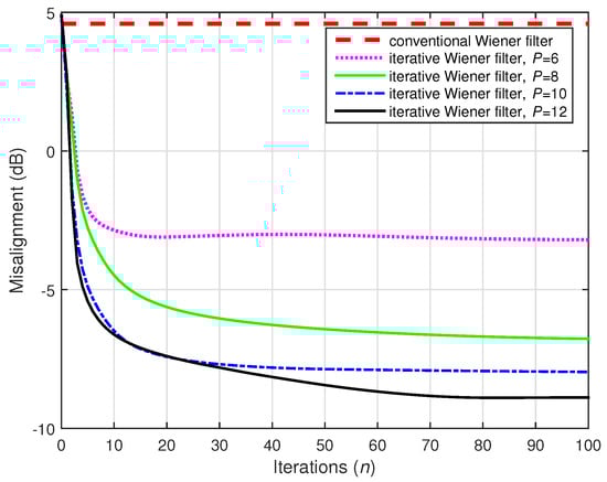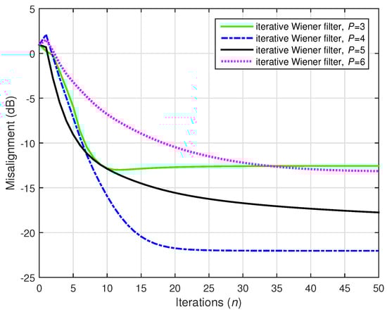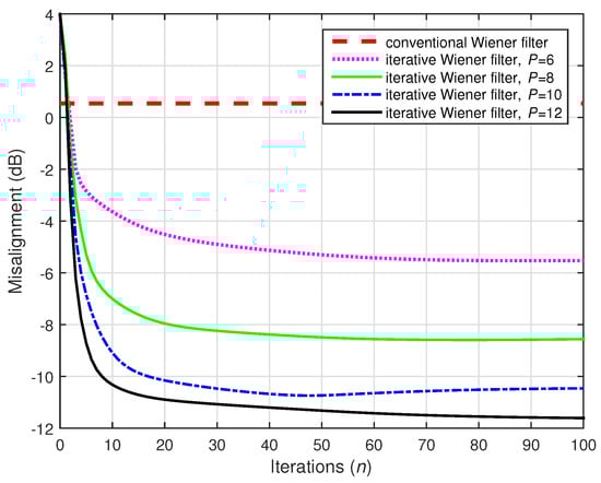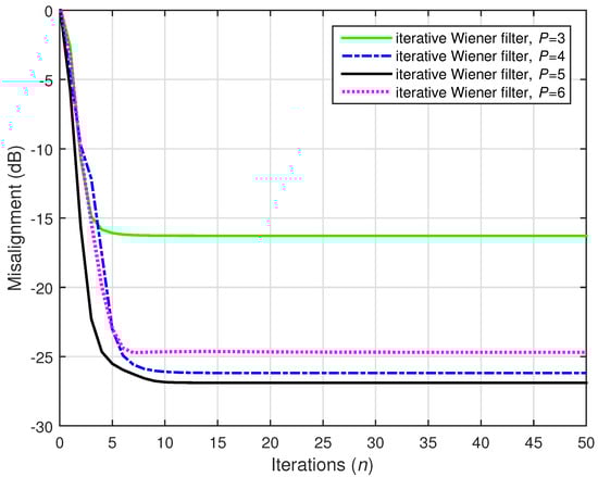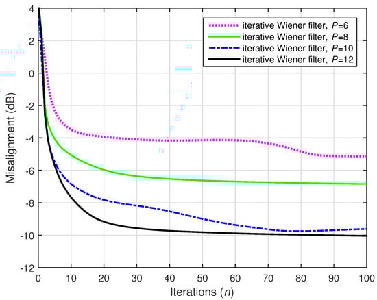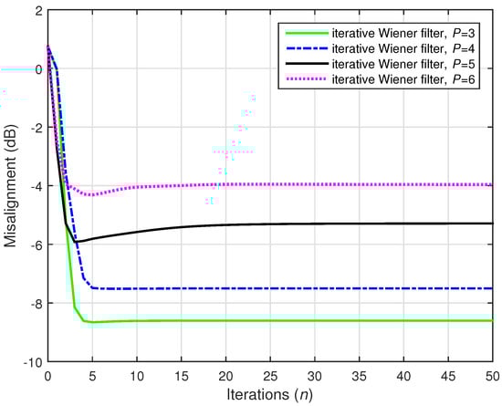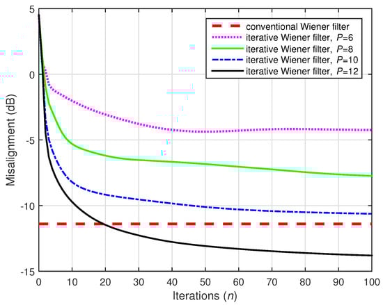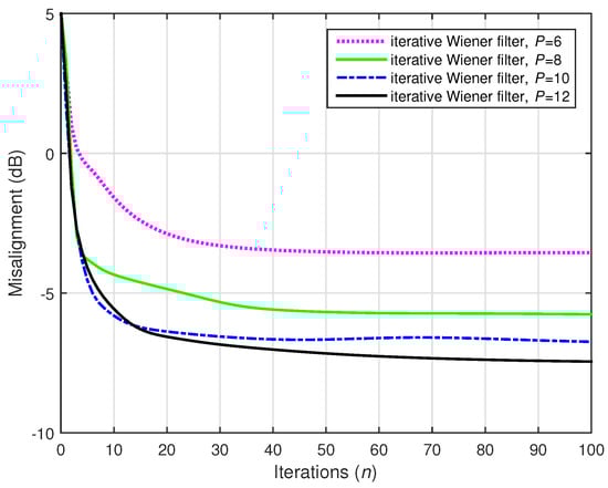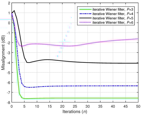 A challenging case was considered in the following two simulations, where we set (while ). Two values of the distortion parameter were considered, i.e., and , and the results are depicted in Figure 22 and Figure 23, respectively. The conventional Wiener filter was not included in these experiments, since it could not provide an accurate solution (as indicated in Figure 17). As we can notice in both cases, despite the adverse conditions, the iterative Wiener filter was still able to attenuate the misalignment to a reasonable extent and provide a robust solution, for a value of P smaller than .