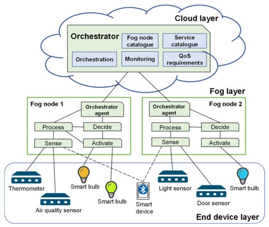 In order to ensure any heterogeneous service provision infrastructure with a scalability, interoperability, and adaptability in mind, fog nodes have to be dynamically deployable [3]. These fog nodes also use constrained resources [1] if they are compared to a cloud infrastructure. Additionally, in order to give access to relevant services as well as to prevent any unauthorized access, access control or privacy control is required [4]. Having that in mind, security and privacy are a big concern [5,6]. Fog computing solutions frequently have insufficient security due to the fact that they rely on intensive communications with constrained devices [7] and constrained resources [8] located at the end device layer. If one of many end devices does not support a communication protocol of a sufficient strength, the security of the whole solution may be compromised. Moreover, roaming services are supported in some fog solutions, when the service follows a human, vehicle, etc., and travels from one fog node to another. In such cases, when any lower security service is brought to a secure fog node, the security of this fog node may be compromised. Similar problems may also occur with other QoS parameters such as a latency, bandwidth, range, etc. However, service orchestrators which are placed in the fog nodes may be used to monitor the whole situation in the fog node (including any communications with neighboring fog nodes) to take any required measures in the case of any potential violations of security and other QoS parameters.