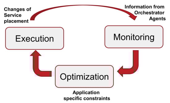 Orchestrator agents locally monitor the hardware and software environment of the fog nodes. They are aware of the current CPU and RAM usage, power requirement and energy levels, available communication protocols and bandwidth, security capabilities, state of the hosted services, etc. They summarize all the collected information to provide it to the orchestrator in the cloud layer. The orchestrator is aware of the current situation in all the fog nodes and, additionally, it has security and QoS requirements imposed by the application area of the IoT solution, and it makes decisions on starting, stopping, or moving particular services among the orchestrated fog nodes. The decisions made by the orchestrator are communicated down to the orchestrator agents inside the fog nodes, then the orchestrator agents initialize the required actions on the services. A control cycle performed inside the orchestrator is illustrated in Figure 3.