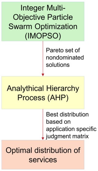 Generally, one common feature of all these objective functions is that they are mutually exclusive. Any optimization of one objective will often be at the expense of affecting the other one. For example, we may consider moving all the services to more secure fog nodes to increase security, but such a service distribution will likely cause reduced power efficiency, excessive load on some of the nodes, and a lower overall runtime of the system. Moreover, different objectives have different measurement units, e.g., security may be evaluated in bits while the power requirement of the services is measured in Watts, any available network bandwidth is measured in kbps, etc. Even if all the measurements are converted to real positive numbers, it is still very difficult to objectively compare them. There is no single solution to a multi-objective optimization problem that optimizes all the objectives at the same time. The objective functions are contradictory in this situation, therefore a set of non-dominated (Pareto optimal) solutions can be found. We propose to use a two-stage optimization procedure (see Figure 4) in order to deal with this situation, where the first step will use a multi-objective optimization to find a set of solutions (possible distributions of services), the elements of which are a Pareto optimal. We propose to use for this the integer multi-objective particle swarm optimization (IMOPSO) method described in the next paragraph. A choice of the particle swarm optimization method is based on the research of other authors [33,34,35] which shows that this method is suitable for a similar class of problems, and it demonstrates good results. We will use the analytical hierarchy process (AHP) in the second step to choose the best solution from a Pareto optimal set.