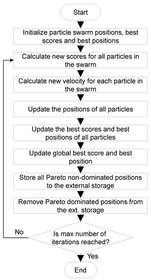 A flow diagram of the integer multi-objective particle swarm optimization (IMOPSO) algorithm is shown in Figure 5.