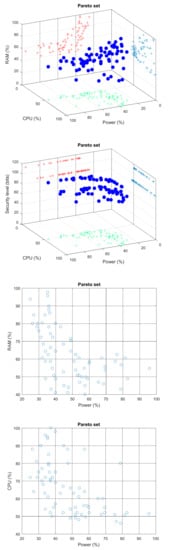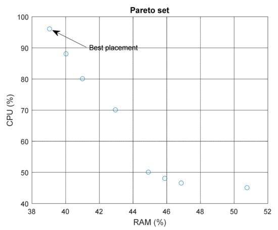 If two objective functions, RAM and CPU, are used, then this judgment matrix means that an even RAM usage distribution among all the fog nodes is more important than an even CPU usage. A Pareto set produced by the IMOPSO algorithm is presented in Figure 8. Then, a Pareto solution set is used in the second stage, employing an AHP, to find the best placement of services. The best placement is summarized in Table 4.
