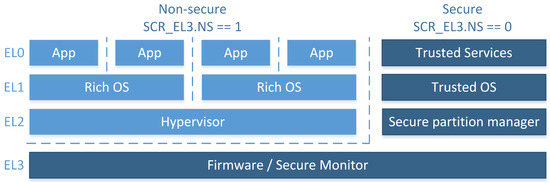TrustZone is a security extension offered by Arm for application processors (Cortex-A family) and microcontrollers (Cortex-M family), which has become popular recently. There is a growing interest in the subject across academia, and a number of commercial products utilize TrustZone’s capabilities, for example, Samsung Knox. Arm’s solution is based on a Trusted Execution Environment (TEE) concept and enables the system to fulfill Platform Security Requirements []—a set of guidelines defined by Arm. This document provides similar guidelines to those gathered in Section 3, with a strong focus on hardware and firmware security. There are some differences between architecture-specific implementations of TrustZone, but the main idea remains the same—on Cortex-A processors, the secure monitor, a privileged software, implements mechanisms for secure context switching between worlds; on Cortex-M processors, there is no secure monitor and hence the change between the secure and non-secure world is handled by a set of core logic mechanisms. Enabling TrustZone for microcontrollers has allowed for more widespread usage in resource-constrained devices, which has an impact on IoT devices. Pinto and Santos [] provided a detailed explanation of TrustZone’s operation with a distinction between Cortex-A and Cortex-M implementation. The general concept of TrustZone’s operation on software and firmware levels is presented in Figure 1.