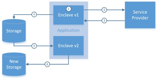 Intel SGX Software Lifecycle; steps are executed in the numerical order, sensitive data are remotely provisioned (3) into the enclave after mutual attestation (2) of the off-platform provider and created enclave (1), after the enclave is destroyed data are sealed in memory (4) in such a way that only an identical enclave can access them again. Software updates (5) are also possible via this scheme and a new seal is created (6) so that an old version of software cannot overwrite the new version. Based on [].