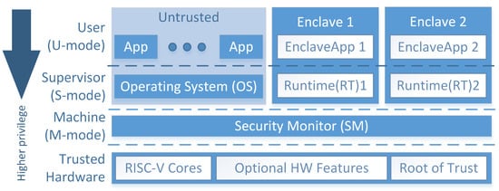 - Lee, D.; Kohlbrenner, D.; Shinde, S.; Asanović, K.; Song, D. Keystone: An open framework for architecting trusted execution environments. In Proceedings of the Fifteenth European Conference on Computer Systems, Heraklion, Greece, 27–30 April 2020; pp. 1–16. [Google Scholar]