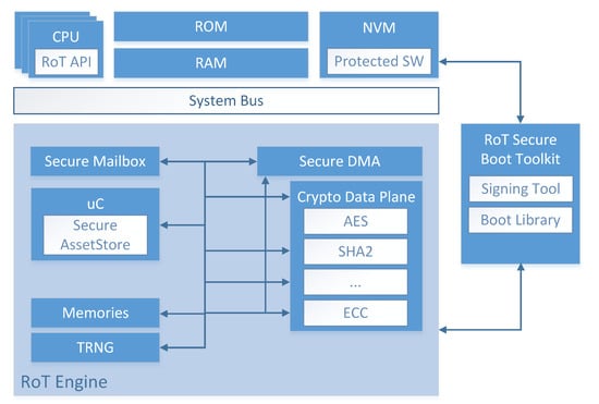 A Root of Trust is a unit that consists of a computing engine, low level code and data (e.g., cryptographic keys). It provides security services/features necessary to establish trust and security within the platform it is a part of. Its vital characteristics are immutability and predictability—the produced results have to be consistent for the same input data. The hardware implementation of an RoT enables the fulfillment of these conditions [,].