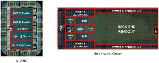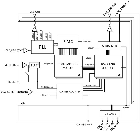 As seen in the floor plan (Figure 2), the TDC core consists of a group of four clusters and the SPI slave interface block, which allows modifying the ASIC configuration via software. Each cluster manages four channels, comprising the following building blocks: