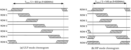 The resistor value, which couples adjacent ring oscillators, is selected in such a way that there are always two DEs switching in consecutive rows (one rising edge and one falling edge) when operating in the typical mode (800 MHz). This avoids any clock duty cycle mismatch between adjacent rows, and it will allow the TDC to obtain time bins smaller than the 20 ps subdelay when combining the phase information of the measurements. Figure 4a,b shows the chronograms for the ULP and HP modes, respectively. It can be seen that the higher the RIMC oscillation frequency is, the higher the row overlapping and the smaller the bin size are. On the contrary, when reducing the RIMC frequency, row overlapping will decrease, and the bin size will increase accordingly. This adjustment can also be used to compensate subgate delay variations produced by changes in the RIMC resistor values, due to wafer-to-wafer and run-to-run variations during the manufacturing process.