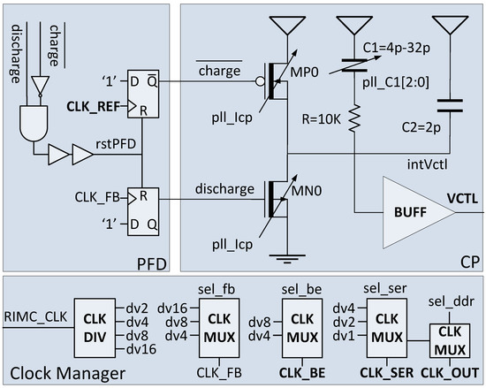 The system clock is obtained from the RIMC, acting as a Voltage-Controlled Oscillator (VCO) from the PLL point of view. The PLL block (see Figure 5) consists of a Phase-Frequency Detector (PFD), a Charge Pump (CP), and the Clock Manager (CM). The PFD generates charge and discharge pulses proportional to the clock phase shift between the external reference clock (CLK_REF) and an internal feedback clock (CLK_FB) [24]. These charge and discharge signals drive the gates of two transistors acting as current sources. The pll_Icp bit allows modifying the delivered current to the intVctl node, which is connected to an RC circuit acting as a low-pass filter. C1 is a 3 bit switched capacitor, which allows a tuning range from 4 to 32 pF. The intVctl drives an operational amplifier acting as a unity gain buffer. This buffer will drive the VCTL node of the four RIMCs in the ASIC. Finally, the CM allows selecting the operating frequencies for the following clocks: feedback (PLL M factor), Backend Readout, Serializer, and ASIC output, which can operate either in SDR (Single Data Rate) or DDR (Double Data Rate) mode.