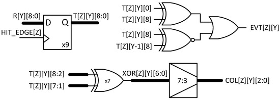 Both edges of the TIME<15:0> inputs are converted into short pulses by the Edge Detectors. As seen in Figure 6, these pulses latch full custom flip-flops optimized for fast timing (mismatch variability optimization and 50% duty cycle of the input data). The output of these flip-flops will contain the phases of the clock matrix coming from the RIMC. For each row, the eight phases plus the dummy node are sampled (T[Z][Y][8:0]). Then, the column identifier is encoded (COL[Z][Y][2:0]) and the event flag is computed (EVT[Z][Y]). This event flag will indicate the backend for which the row detected a transition, and it has to be taken into account to compute the TDC fine counter value.
