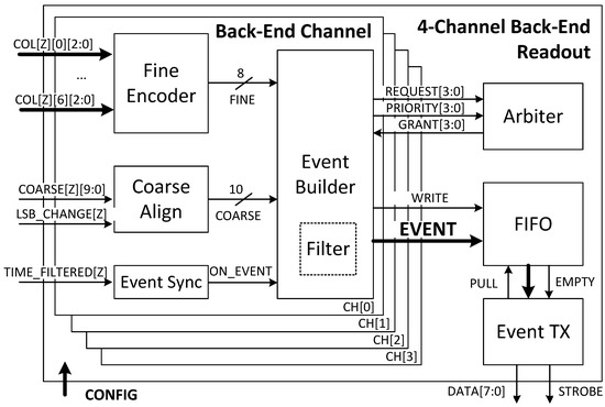 Moreover, this block implements a filter that allows the user to ignore those TIME pulses narrower than a certain pulse width (programmable) and, in this way, avoid very short pulses produced by dark noise and afterpulsing on the SiPMs [23], which may produce readout errors. The decision of whether to discard the event or not is made by the Backend Readout block, and therefore, this circuitry does not add any timing uncertainty to the input hit.