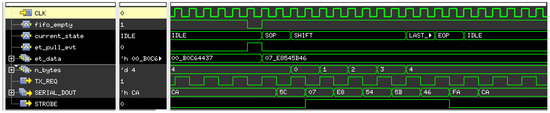 Finally, the event transmitter block converts events into bytes and manages the data transmission protocol: it adds the Start-of-Packet and End-of-Packet bytes before and after the event transmission and the Idle byte when there is no activity. A chronogram example can be seen in Figure 8.