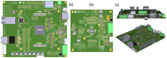 MATRIX16 test PCBs. (a) Motherboard hosting the MAX 10 FPGA, power regulators, and connectors. (b) Mezzanine board with the QFN64 footprint and socket. (c) Boards coupled via LHSM connectors.