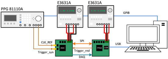 The FPGA generates Trigger_rnd to perform calibration measurements, which is uncorrelated with the CLK_REF generated by the PPG. This allowed analyzing the statistical behavior of static Process, Voltage, and Temperature (PVT) variations, thus obtaining calibration tables and computing linearity for each ASIC. For the jitter measurements, both CLK_REF and Trigger_syn are provided by the PPG. This generator produces a pulse in phase with the clock, which can be electronically controlled via GPIB.