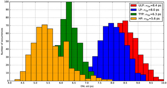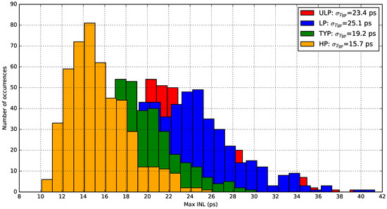 It is important to mention that once the corrections obtained from calibration data were applied, the DNL’s standard deviation was reduced to 2–4 ps, and the maximum INL became negligible.