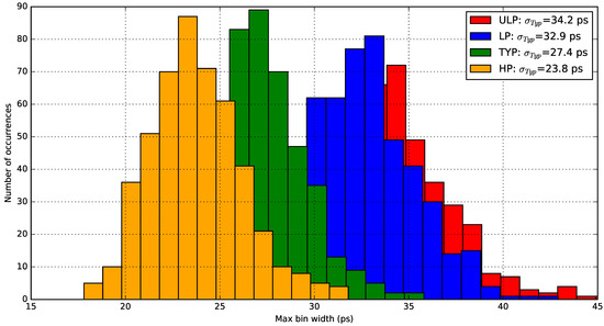 Figure 11 shows the DNL standard deviation distribution for the 240 channels, showing that the DNL standard deviation was typically around 2/3 of its corresponding fine counter LSB in all the operation modes. Figure 12 shows the maximum INL, which was typically around 2 LSB (3 LSB in the worst case). Figure 13 shows the maximum bin width that we could obtain from each TDC channel. This measurement allowed determining what the single-shot precision was in the worst scenario: around 3.5 LSB.