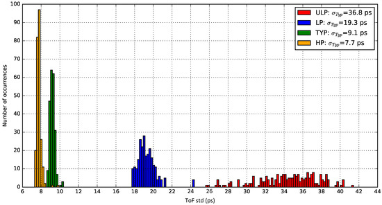 Figure 14 shows the ToF jitter standard deviation distribution for the 240 channels. It can be seen that for the same power supply voltage (TYP and HP modes), jitter linearly increased with the RIMC period, while it dramatically increased as the RIMC power supply scaled down (LP and ULP modes).