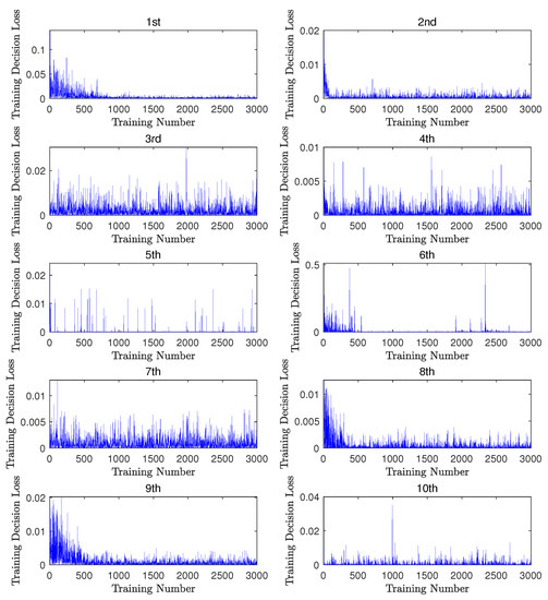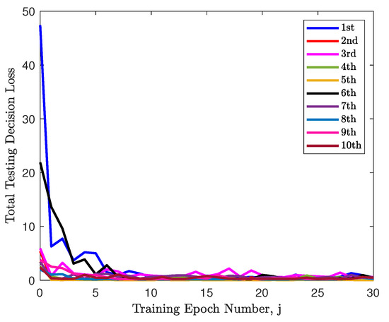 is computed to evaluate the training performance of the machine learning method; in other words, the decision loss, where the subscript denotes the training epoch number. Since the testing set is independent of the training set , it is possible to use the evaluation results to double-check the training performance of the machine learning design using external data from the training set, which avoids the limitation of over-fitting.