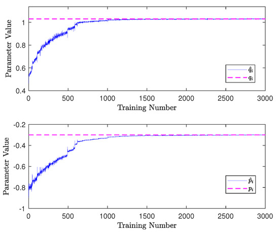 Furthermore, the updated estimate was compared with the benchmark values for each training update, and the results of the first department are plotted in Figure 4. For comparison, the corresponding benchmark values are plotted in the same figure as the dashed magenta lines (the mean value of is used for comparison). It is observed that the estimated values asymptotically converged to their benchmark values, which means that the converged estimate matched well with its benchmark. The converged estimates were