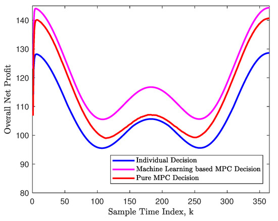 The comparison of the overall net profits at each sample time index for individual decisions, machine learning-based MPC decision and pure MPC decision.