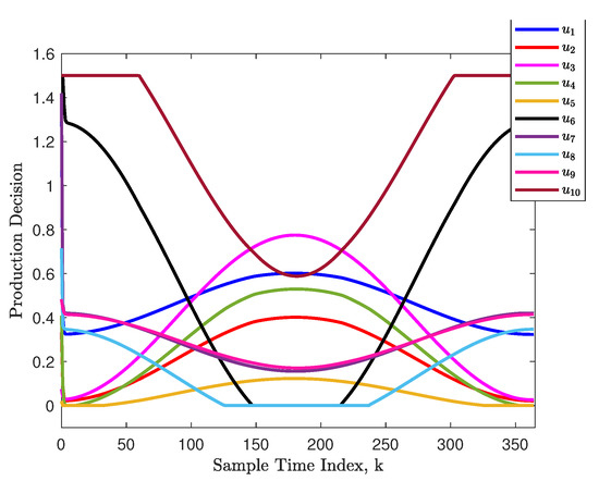 Since the machine learning procedure in Section 5.2 provided an accurate estimate of the unknown parameter values, the information within the production problem made it feasible for the regulator to make the optimal decisions. The MPC decision making procedure of Algorithm 1 was performed for the production planning problem specified in Section 5.1 with a unit prediction interval (), using the given system dynamics (1) and the desired cost function (8).