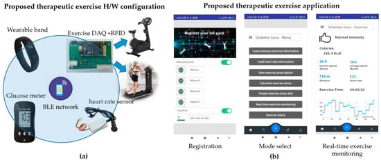 The proposed therapeutic exercise platform: (a) Hardware configuration; (b) Smartphone application of the proposed platform.