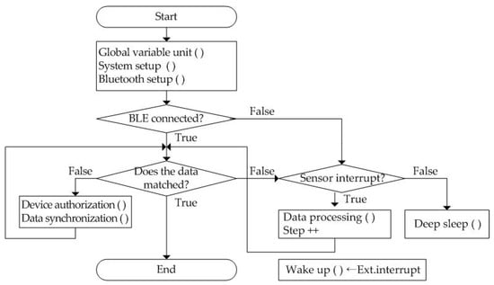 The wearable band starts at the start stage and precedes system initialization as shown in Figure 4. By executing Global variable unit (), System setup (), and Bluetooth setup (), system-wide variables are initialized, processor I/O pins are set, and Bluetooth profiles are set, respectively. Then, the smartphone application initiates information synchronization with the wearable band over a Bluetooth network when it is connected. Next, it compares the data stored by the wearable band and the smartphone application. If the data are matched, it ends immediately. Otherwise, it starts to perform the data synchronization process after device authentication of the wearable band.