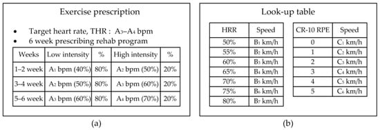 Figure 7 shows an example of an exercise prescription at the early stages of diabetic diagnosis. After the exercise test, the patient receives the prescribed target heart rate and weekly target exercise intensity based on heart rate, as shown in Figure 7a. Figure 7b shows a look-up table. During the exercise test, the patient’s heart rate and the RPE are linked with the exercise intensity at each test step, and they are recorded in a look-up table. This table shows the relationship between the heart rate and exercise speed obtained each time the patient exercised. It is used to tune the exercise speed in the exercise session before the patient exercises.