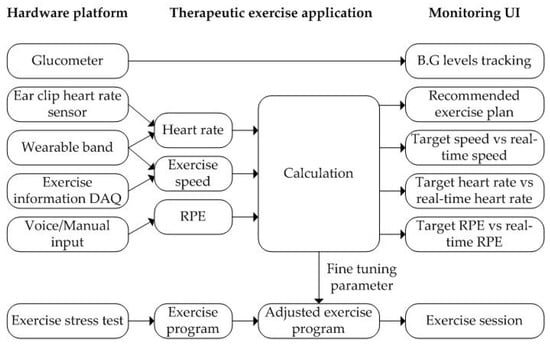 This study proposes a system that supports diabetic patients to manage their blood glucose levels using the proposed therapeutic exercise platform, as shown in Figure 2. The proposed system has three main functions.