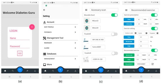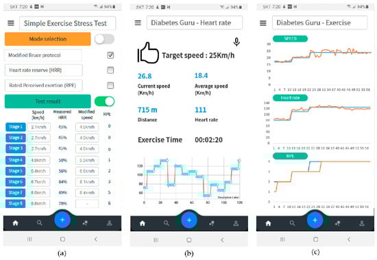 The proposed test allows the patients to run simply exercise tests whenever necessary. The test result is used to adjust the intensity of exercise to match the patient’s exercise ability. Busch et al. [] presented the classification of physical activity intensity using the 2009 ACSM (American College of Sports Medicine) classifications. Low intensity is classified as 50–63% HRRmax. Moderate and vigorous intensities are 64–76% HRRmax and 77–93% HRRmax, respectively. We considered the appropriate exercise intensity to be sufficient to reach 50–76% HRRmax. Additionally, moderate and intermittent medium or high-intensity exercise for 45 min or more is beneficial for blood glucose management. Consequently, patients can adjust their exercise intensity and time after setting the coaching algorithm according to their abilities. We developed a smartphone application to provide an exercise monitoring and coaching program based on their exercise stress test results.