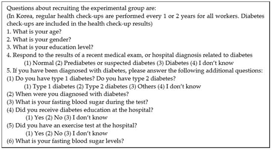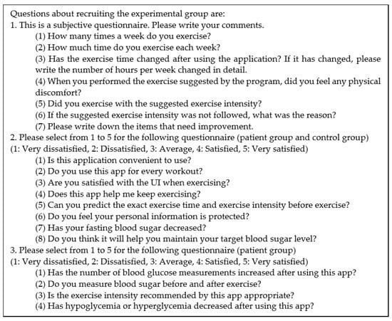 A closed beta service has been performed since 2017. We released our application to Google play store for a closed test. Among the users who used the application who answered that they had a high understanding of diabetes, diabetic patients and those who did not have a diagnosis of diabetes were selected and the experimental group was recruited. Finally, we selected the patient population from patients with a prevalence of 3 years or more and a fasting blood glucose level greater than 160 mg/dL. The questionnaire is shown in Figure 13. For platform evaluation and future improvement, we received satisfaction ratings and functional improvements through a questionnaire survey as shown in Figure 14 on 10 type 2 diabetes patients and ten persons without a diabetes diagnosis as shown in Table 7. Overall, the patients and others expressed high satisfaction with ease of use. The patient’s additional opinions are as follows. First, it is necessary to update diabetes education about therapeutic exercise. Second, exercises after a meal increased compared to before use. Third, if the function to share experiences with other users is added, motivation will be better. Fourth, it is necessary to provide the personal exercise coaching or consulting function for an exercise. Finally, the number of symptoms of hypoglycemia decreased after exercise. Moreover, it became possible to control the exercise time and intensity according to the amount of meal.