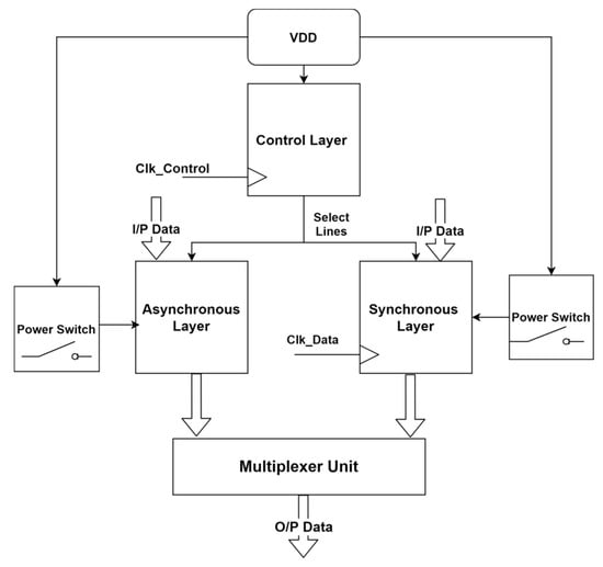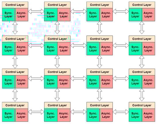 NoCs absorb a considerable amount of the chip’s power consumption []. There were many efforts dedicated to introducing efficient NoC designs in terms of power dissipation. Several tracks were utilized to minimize both the static and dynamic power consumption. The dynamic voltage and frequency scaling (DVFS) technique was incorporated for systems characterized with varying load frequencies to diminish dynamic power consumption []. The power gating approach was employed for minimizing static power consumption [,]. For synchronous systems, clock gating was introduced to lessen the dynamic power consumption []. The globally asynchronous locally synchronous (GALS) design paradigm was established specifically for system-on-chip (SoC) []. It addresses the clock skew obstacle, reduces the overall power consumption and maintains high system performance. GALS systems are considered the incentive for the rise of asynchronous designs specifically for communication purposes [,].