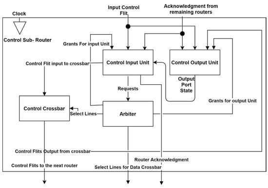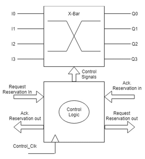 The control subrouter’s operation is synchronized with a clock signal. The arbiter is designated to sort the requests coming from other routers. The requests are granted following a round-robin protocol. The FSMs are used to indicate the state for each input or output port. The main states for the ports are idle, reserved or active. The state for each port depends on several parameters, including (1) the grants from the arbiter based on the order of the accepted requests, (2) the acknowledgment signals coming from the succeeding routers along the path, indicating a successful reservation process, and (3) the control flit carrying information regarding the source and destination addresses. The crossbar is responsible for routing the control flits. The architectural view for the control subrouter is shown in Figure 5.