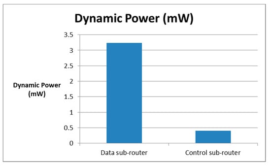 To corroborate this indication, a power analysis was conducted on the basic fully synchronous circuit-switched NoC, and the results are shown in Figure 4. This analysis was conducted for the fully synchronous router with 65-nm technology under the same evaluation specifications mentioned in Section 3.3. The results indicate that the dynamic power consumption for the data layer was significantly larger compared with the control layer. According to the traffic variations, the power consumption percentage would also differ, yet in all realistic cases, the data transfer layer would consume additional power compared with the control layer.