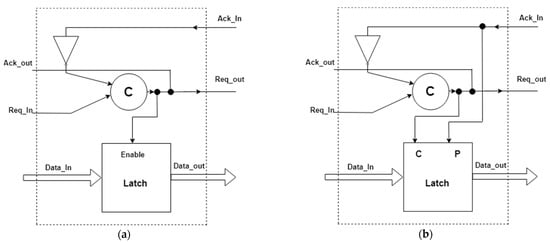 The main difference in the pipeline stage for the four- and two-phase protocols is in the type of latch used, as shown in Figure 6. The first pipeline design is shown in Figure 6a; it implements a four-phase handshake protocol. Four-phase protocols follow four actions per each transmission process. These actions are performed through two separate signals: the request and acknowledgment signals. Two transitions are dedicated to ensuring that the cycles consistently end with the same polarity (typically zero). This reduces the complexity of the hardware design at the expense of expansion in the cycle time. The pipeline stage consists of a latch and a C-element. The C-element allows data to pass through the stage only if both the request signal of this stage and the acknowledgment signal of the next stage are equal to logic 1. This means that there are data available at the current stage and the next stage is ready to process the data. The latch is a positive latch that allows the transmission of data based on the enable value (output of the C-element).