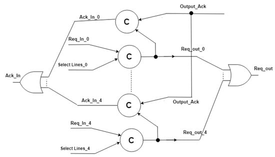 The crossbar stage is responsible for routing the data across the network. For asynchronous designs, it is responsible for routing the request and acknowledgment signals as well. The request signals travel along the data in the same direction, whereas the acknowledgment signals traverse the network in the opposite direction. Data routing is completed based on the control signals produced by the control subrouter. This is implemented using a multiplexer with five possible inputs and one output. This multiplexing stage is repeated for each output port (five multiplexers). The routing for the handshake signal contains an extra design element. It integrates C-elements along with the basic multiplexing gates to ensure the stability of the control signals, which is crucial for asynchronous designs. This stage is repeated at every output port to produce the request signal entering the pipeline stage in the forward path and the acknowledgment signal entering the pipeline stage in the backward path. For example, the request signal at each output port is selected from the five possible input ports with the use of the selected lines. The modified multiplexer for routing the control signals is shown in Figure 7.