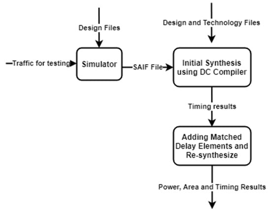 For asynchronous designs, timing analysis is more challenging specifically for single-rail protocols. The data must remain valid throughout the handshake protocol. To ensure this condition, the best-case delay for the control path must be higher than the worst-case delay for the data path. These constraints were added to the compiler tool. If these constraints were verified, matched delay elements were added to the control path. The synthesis process was repeated until all the constraints were attained. Then, the results for the power consumption, timing analysis and area utilization were extracted. The flow for simulation and synthesis is shown in Figure 8.