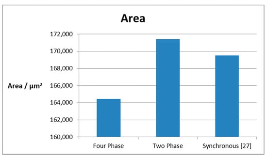The first results to examine in Figure 9 are the area comparisons among the three protocols. For the 4 × 4 NoC, the two-phase design had the highest occupied area among the three designs. The area for the two-phase design increased by 1.12% when compared with the synchronous design due to the added design complexity. The four-phase protocol had the lowest area among the designs, being 3% lower than the synchronous design. The area reduction could be due to the elimination of clock signals and their associated circuitry. Area comparisons are not crucial for the dark silicon phenomena, since a significant chip area is not fully utilized and the differences between the protocols are not consequential.