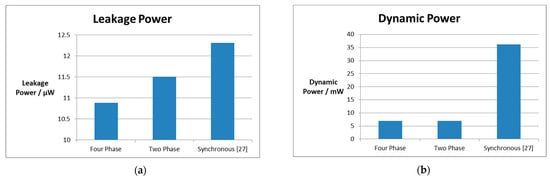 The results for the leakage power are shown in Figure 10a. The comparisons demonstrate that the leakage power consumption for both asynchronous protocols was lower than that of the synchronous design. The reduction in power consumption was 7% and 13% for the two-phase and four-phase protocols, respectively, when compared with the synchronous design. The two-phase protocol had an increase in leakage power consumption over the four-phase protocol due to the added design complexity. The dynamic power consumption under the randomly generated traffic is presented in Figure 10b. The analysis was conducted with the extracted SAIF file for accurate dynamic power measurements. The same traffic was applied for all protocols for fair comparisons. The results showed a significant reduction in the consumed dynamic power for the two asynchronous protocols. The consumption was almost 80% lower than that of the synchronous design.