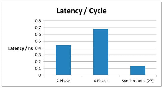 Finally, the latency comparisons are shown in Figure 11. This latency was measured as the time taken to complete the transfer of data through a single router using the longest or worst path. The results indicated that the synchronous design was more efficient in the time comparison aspect. The four-phase protocol had an increase in latency of 80%. The two-phase protocol had a latency increase of 70%. This was expected, as the four-phase protocol had more transitions per cycle when compared with the two-phase protocol.
