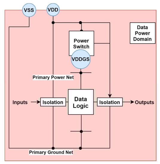 The addition of power gating was accomplished through inserting another layer on top of the VHDL design files. Unified Power Format (UPF) files were responsible for specifying power domains and modes. The router was divided into three power domains: the data domain, the control domain and the router domain that encapsulated the previous two subdomains. The gating was applied to the data domain by inserting power switches and isolation cells. The power switch was added to the net connected with the power supply. The switch was turned on based on the value of the control signal to connect the data domain with the power supply. The isolation cells were added as a precautionary measure to maintain the system’s functionality. These cells isolated the deactivated blocks from the remaining operating system, so they were added to the input and output ports. There was no need to add retention cells as the output of the deactivated blocks would not affect the operating system as a whole. The gated data power domain is shown in Figure 12.