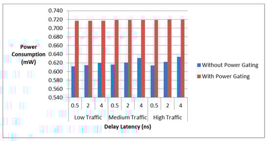 The NoC size used for evaluation was 4 × 4 with the 32/28 nm technology library. The data packet size was 32 bits, with one extra bit as a flag for activating the powered-off data subrouters. There were two separate sets of analysis conducted. The first power analysis was dedicated to measuring the effect of power gating. This analysis was conducted with a single-layered NoC with and without power gating. The analysis was conducted using different traffic points and varying load frequencies to examine the impact of power gating. As shown in Figure 15, the layer implemented with power gating had smaller power consumption when compared with the layer implemented without power gating. This effect took place regardless of the traffic case or the frequency of the system load. This highlights that the effect of the added overhead due to the extra hardware used in power gating implementation was smaller than the power saved. Based on this conclusion, the power gating was implemented in the double–layer NoC for power optimization.