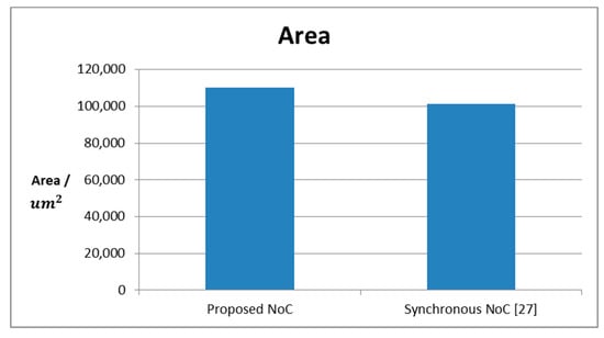 The area comparisons, which were indicators of the cost of the design, are presented in Figure 16. As is shown, the proposed design had a slight increase in area of 8%. This increase in area is logical due to the added complexity of the asynchronous design in one of the layers. However, this increase was not significant, and the area was not the impactful aspect when it came to the design specifications for large systems. The power and latency were the major concerns, since the area was not fully utilized under the dark silicon phenomena.