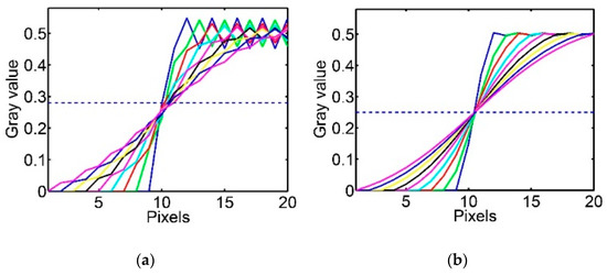 Another aspect that needs to be examined is the intersection part between different gray-level regions, such as the sections of () and () shown in Figure 1. For the conventional ternary coding method, the thresholds need to be carefully chosen because of the set δ value, which are about Th1 = 0.28 and Th2 = 0.72 [14]. Actually, due to the asymmetric character, well-picked thresholds may even fail when the projector is not well defocused. Gaussian filters with different sizes were applied to the designed coding patterns, and the cross sections of the intersection part between the black and gray regions for the conventional and improved methods are plotted as shown in Figure 5a,b. From these figures, it can be seen that it is hard to give an accurate threshold for all defocusing levels for the conventional method since the gray values diverge around the intersection point (10.5 pixels). In contrast, for the improved method the gray values converge and it is easy to set δ = 0; then, Th1 = 0.25 in Equation (8). Similarly, the other threshold can be accurately set as Th2 = 0.75 in Equation (9).