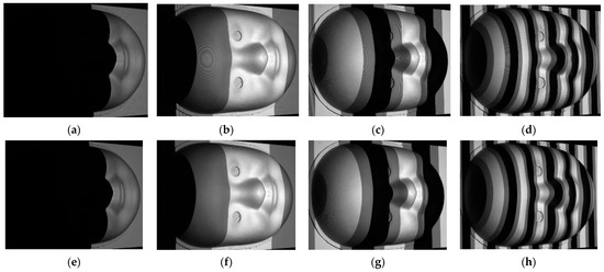 In the experiments, in order to cover the whole projection range, there should be four coding patterns for both ternary Gray-code methods. Figure 6a–d show the four coding patterns for the original ternary coding method when the projector is nearly focused, while Figure 6e–h show the coding patterns for the proposed method. From the figures, it can be seen that the structures or variations are clearly noticeable for the original method in the intermediate gray region, while the proposed method provides a more smooth intensity distribution.