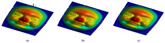 To better compare the performance, experiments with different defocusing levels were also carried out and the final 3D results are shown in Figure 8. Figure 8a,d respectively show the results of the conventional and the proposed methods when the projector is nearly focused. Figure 8b,e show the results when the projector is slightly defocused, while Figure 8c,f show the results when the projector is significantly defocused. For the conventional ternary Gray-code method, there are obvious errors around the forehead region when the projector is nearly focused and, by increasing the defocusing effect, the number of errors is reduced for the forehead region, which is reasonable since the intermediate gray region would be smoother. However, the significant defocusing effect could introduce other problems, as shown in Figure 8c, because the intersection region will be blurred and there will be shifts in the detected codewords around the boundary regions. For the proposed ternary Gray-code method, the best result is obtained when the projector is nearly focused as shown in Figure 8d. When the projector is slightly defocused, the recovered 3D result still has good quality. However, when the projector is significantly defocused, boundary errors are introduced as shown in Figure 8f.